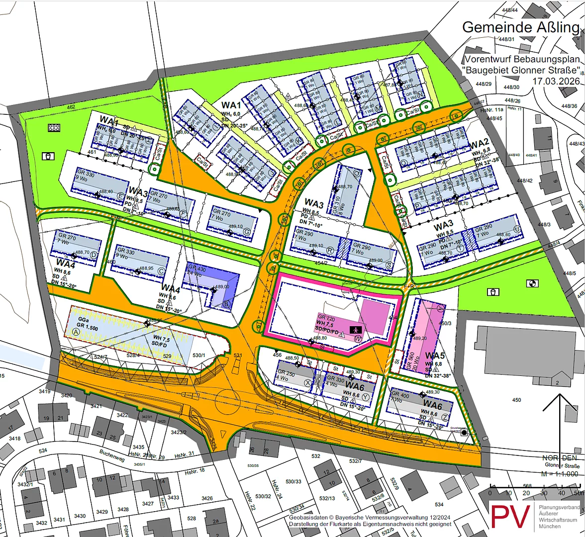 Der Gemeinderat der Gemeinde Aßling hat in seiner Sitzung am 16.05.2023 die Aufstellung des Bebauungsplans „Nördlich der Glonner Straße“ beschlossen. Der Gemeinderat der Gemeinde Aßling hat in seiner Sitzung am 17.03.2026 den Entwurf des Bebauungsplans „Nördlich der Glonner Straße“ gebilligt.