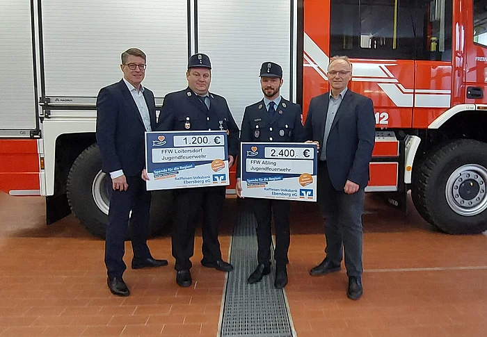 Die Raiffeisen-Volksbank Ebersberg spendete im Rahmen ihrer Weihnachtsaktion 2024 insgesamt 6.000 € an die Jugendfeuerwehren der Verwaltungsgemeinschaft Aßling. Davon bekam die Jugendfeuerwehr Loitersdorf 1.200 € und die Jugendfeuerwehr Aßling 2.400 € zugeteilt.