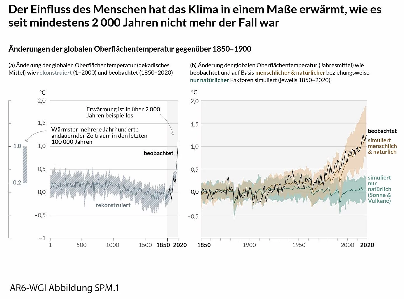 Der Einfluss des Menschen hat das Klima in einem Maße erwärmt, wie es seit mindestens 2.000 Jahren nicht mehr der Fall war. Dadurch lag die globale Oberflächentemperatur im Zeitraum 2011–2020 um 1,1 °C höher als der Wert von 1850–1900.